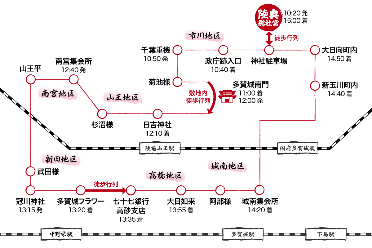 陸奥総社宮 → 神社駐車場 → 政庁跡入口 → 千葉重機 → 菊池様(市川)→ 多賀城南門 → 日吉神社 → 杉沼様(南宮)→ 南宮集会所 → 山王平 → 武田様(新田)→ 冠川神社 → 多賀城フラワー → 七十七銀行高砂支店 → 大日如来 → 阿部様(城南)→ 城南集会所 → 新玉川町内 → 大日向町内 → 陸奥総社宮