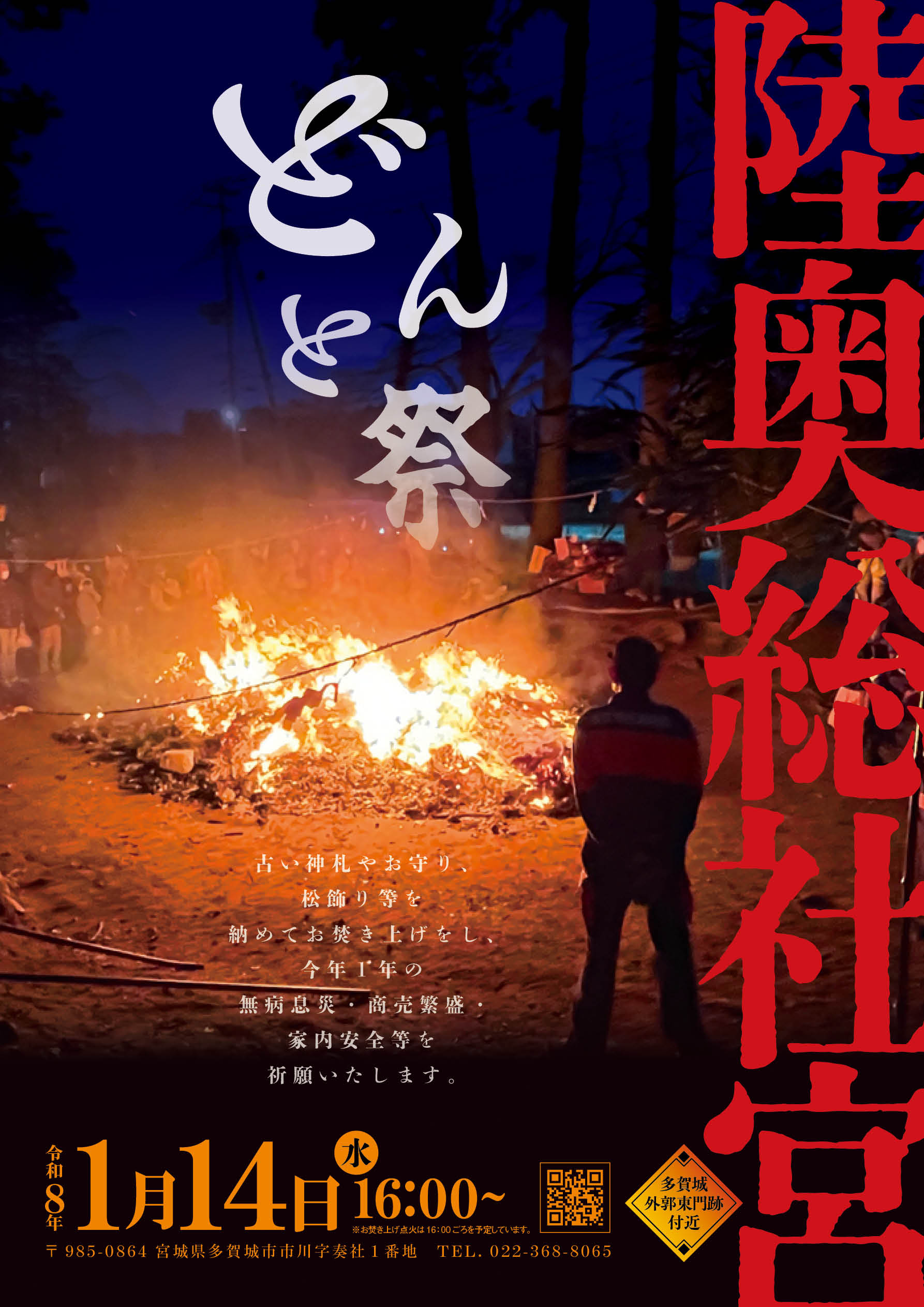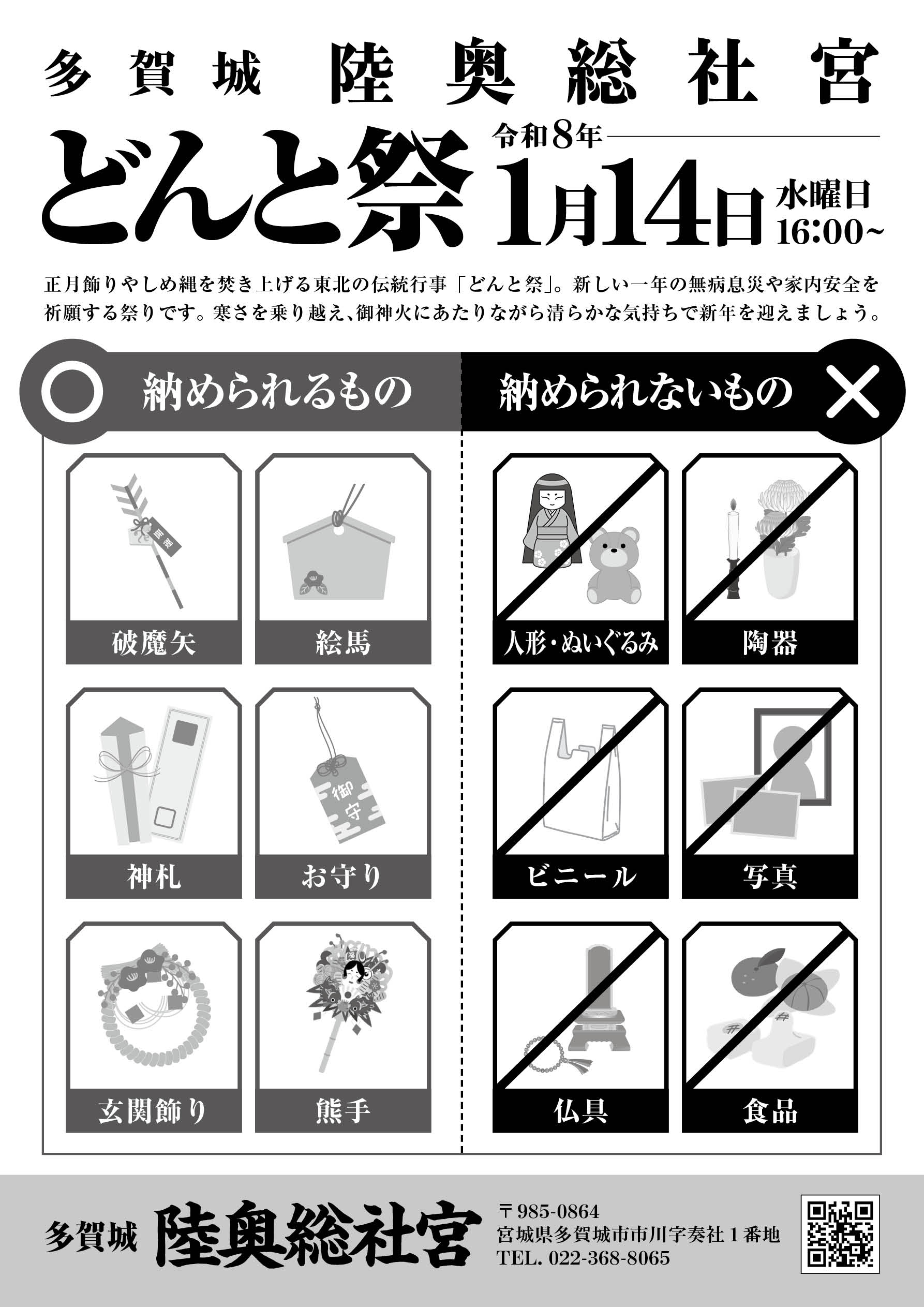 どんと祭のご案内 2026.01.05 古い神札やお守り、松飾り等を納めてお焚き上げをし、今年1年の無病息災・商売繁盛・家内安全等を祈願いたします。 令和8年1月14日(水) 16:00〜 お焚き上げ点火は16:00ごろを予定しています。古い神札やお守り、松飾りは前日より祭場に納めることができます。 2017年どんと祭