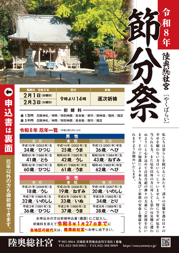令和8年 2月1日(日)・3日(火) 受付時間 各日 午前9時より14時まで(逐次祈祷)